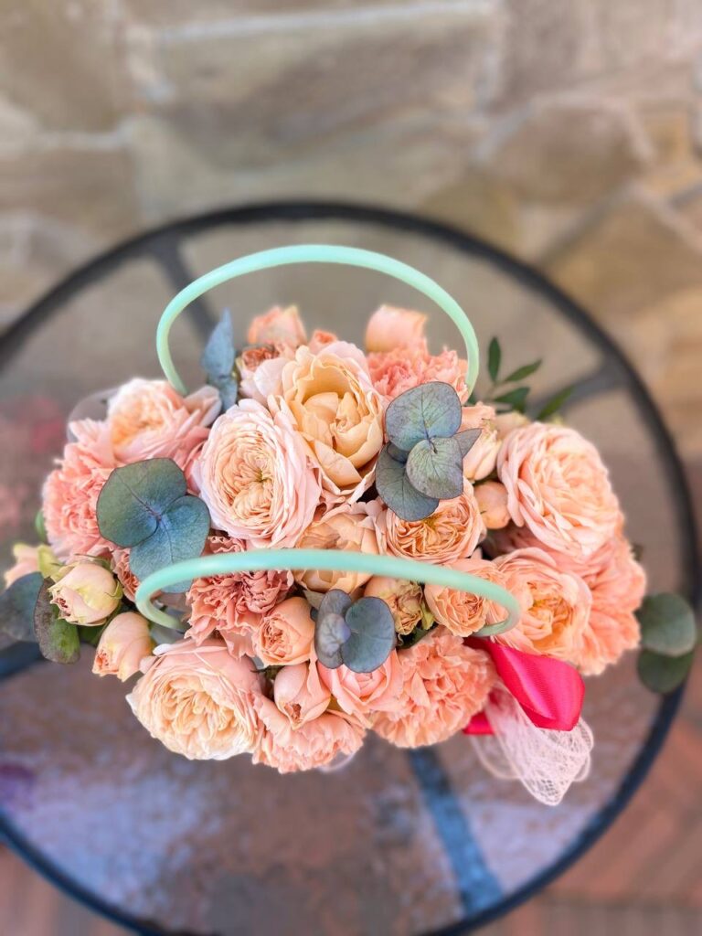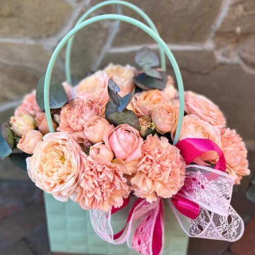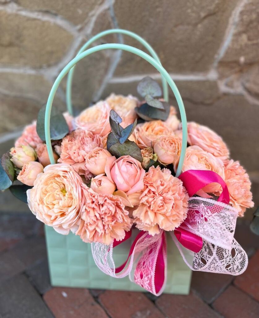 Композиция — букет в виде сумочки мятного цвета с двумя ручками. Основу составляют пышные розы и гвоздики нежно-персикового и кремового оттенков, дополненные тёмно-зелёными листьями эвкалипта. Декор: ярко-розовая атласная лента и белая кружевная вставка. Цветы плотно уложены, создавая округлую форму. Пастельная гамма с ярким акцентом ленты выглядит изысканно. Универсальный подарок, сочетающий практичность и эстетику.